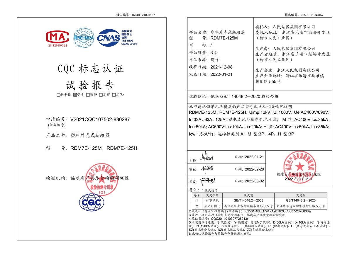 CQC试验报告(202203):RDM7E-125M,RDM7E-125H塑料外壳式断路器(点击下载)