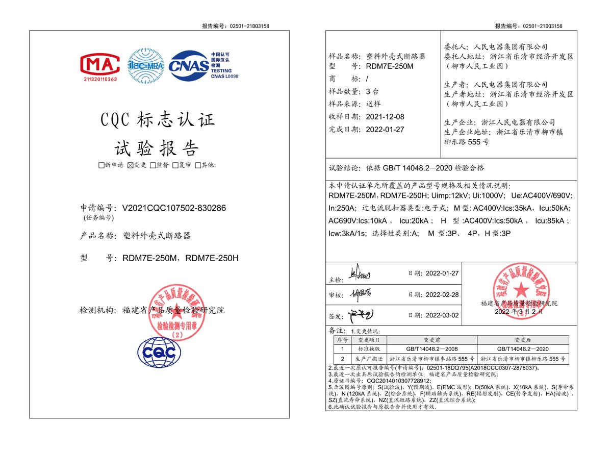 CQC试验报告(202203):RDM7E-250M,RDM7E-250H塑料外壳式断路器(点击下载)