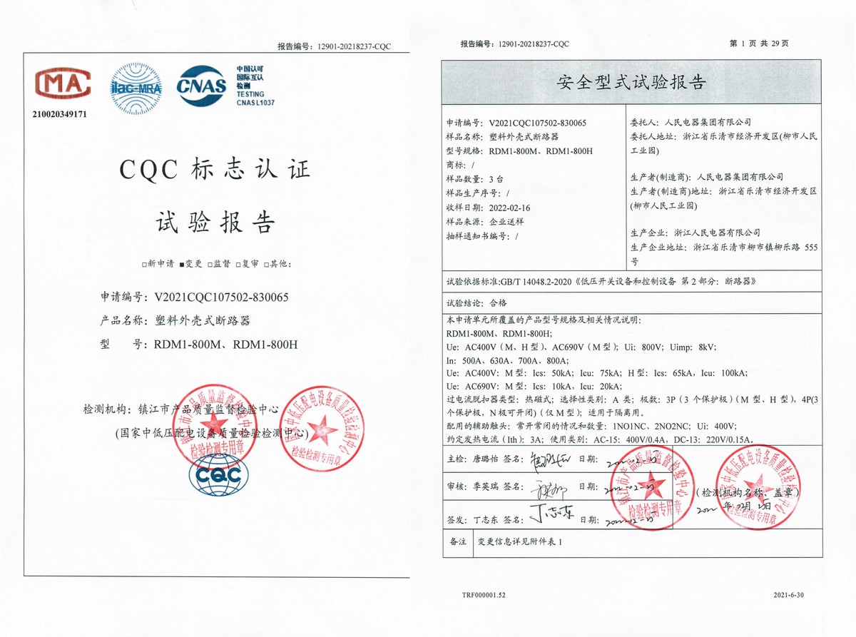 CQC试验报告(202202):RDM1-800M,RDM1-800H塑料外壳式断路器(点击下载)