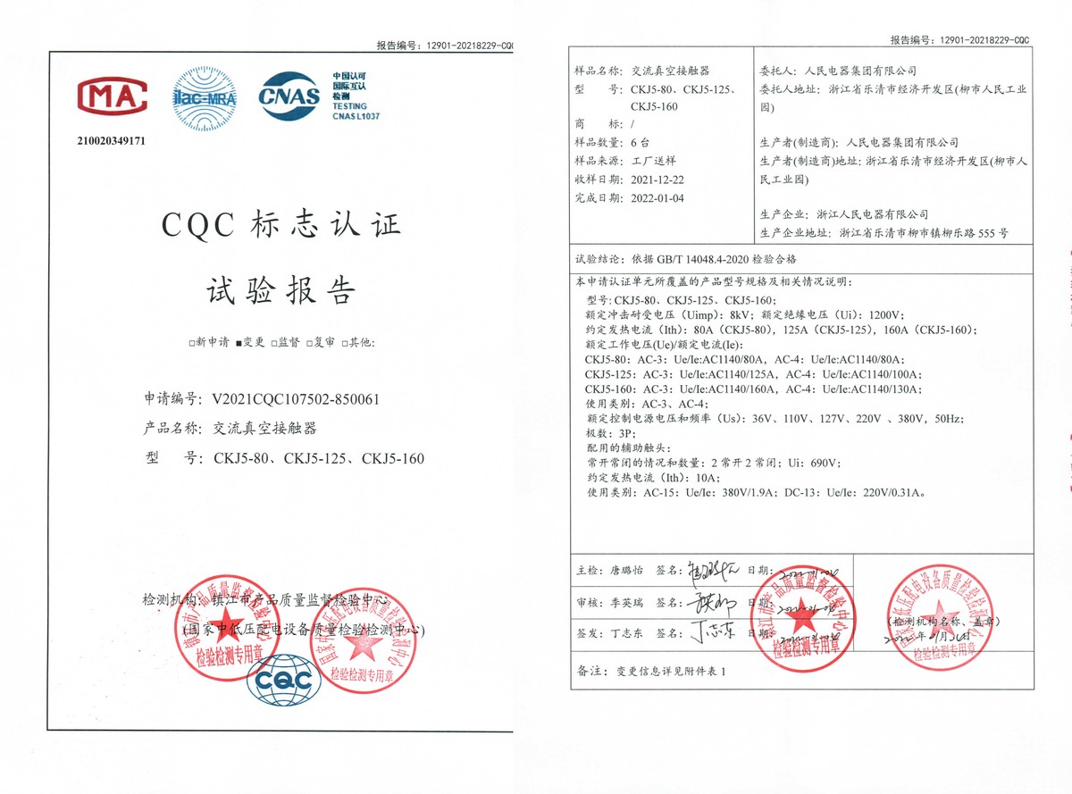 CQC试验报告(202201):CKJ5-80,CKJ5-125,CKJ5-160交流真空接触器(点击下载)