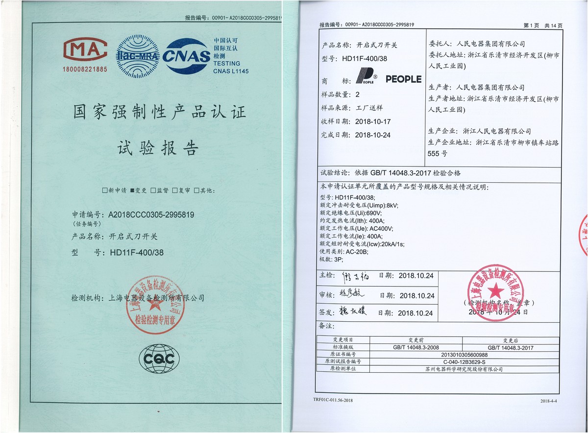 CCC试验报告(201810):HD11F-400/38开启式刀开关(点击下载)