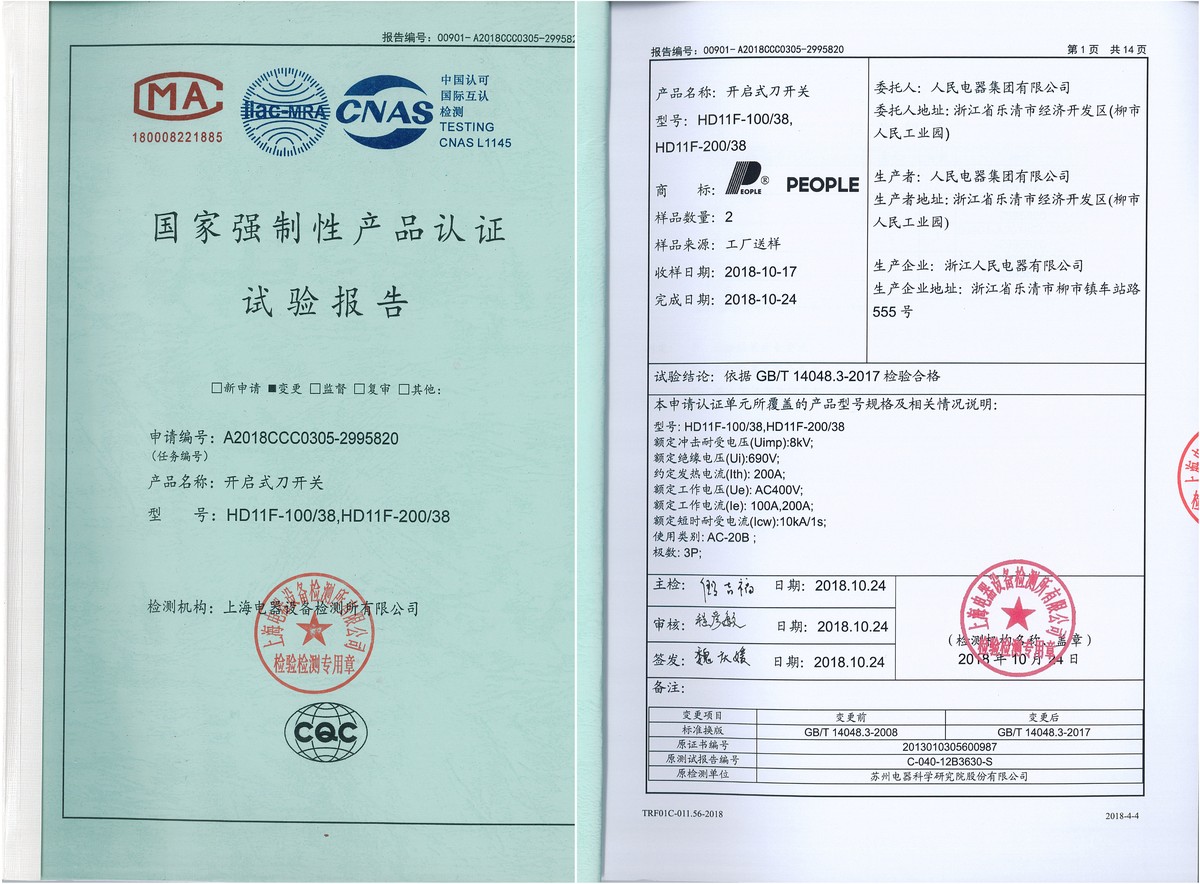 CCC试验报告(201810):HD11F-100/38、HD11F-200/38开启式刀开关(点击下载)
