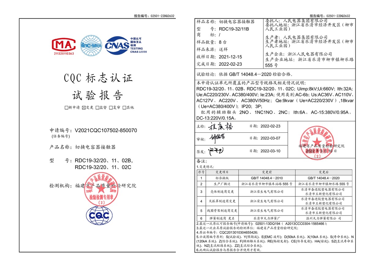 CQC试验报告(202203):RDC19-32B,RDC19-32C切换电容器接触器(点击下载)