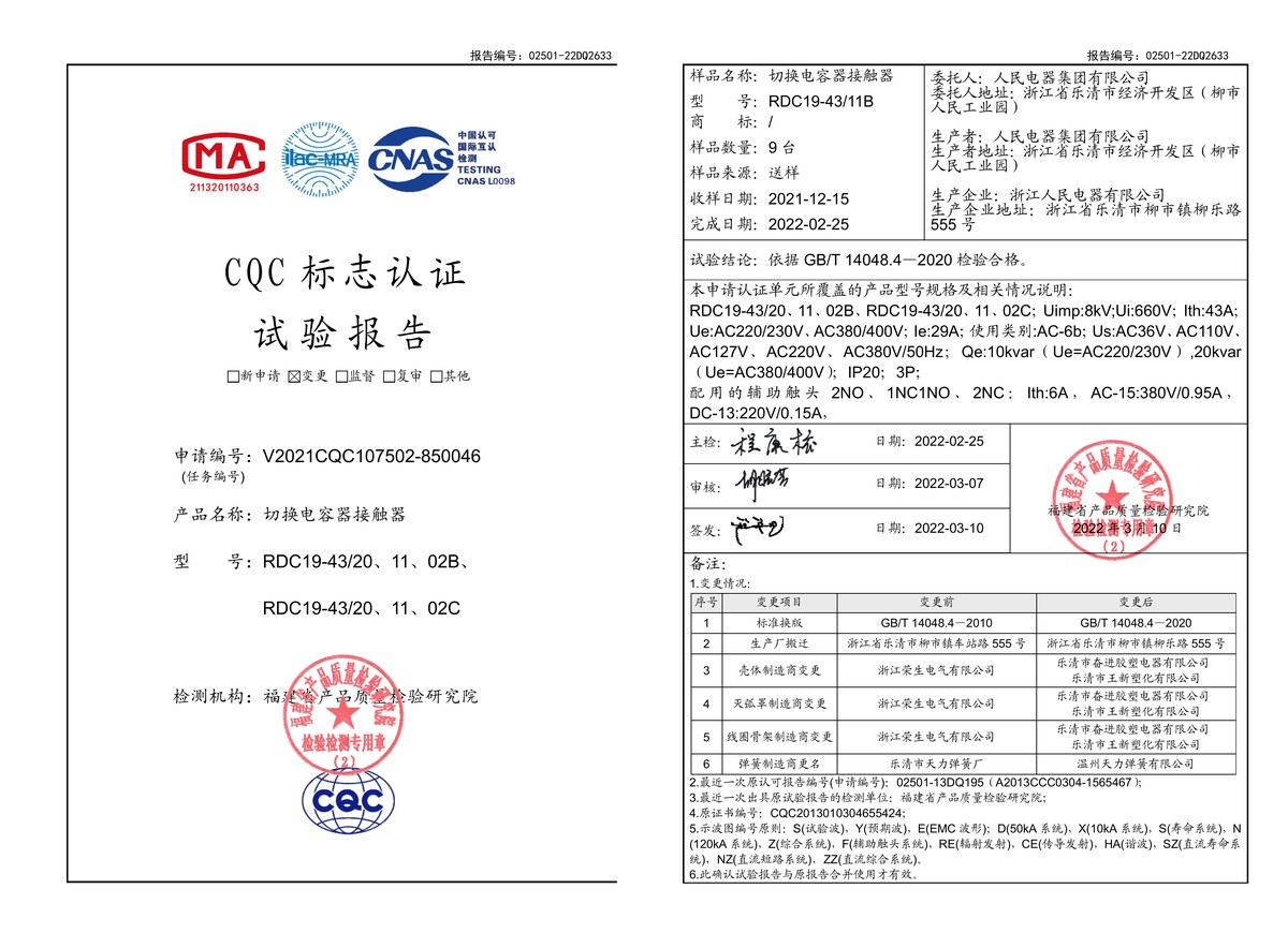 CQC试验报告(202203):RDC19-43/20B、RDC19-43/11B、RDC19-43/02B/C切换电容器接触器(点击下载)