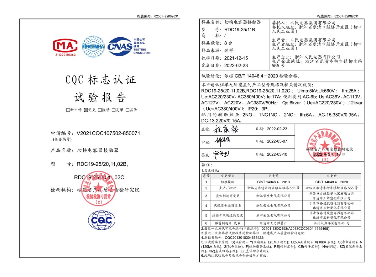 CQC试验报告(202203):RDC19-25/20B,RDC19-25/02B,RDC19-25/11B切换电容器接触器(点击下载)
