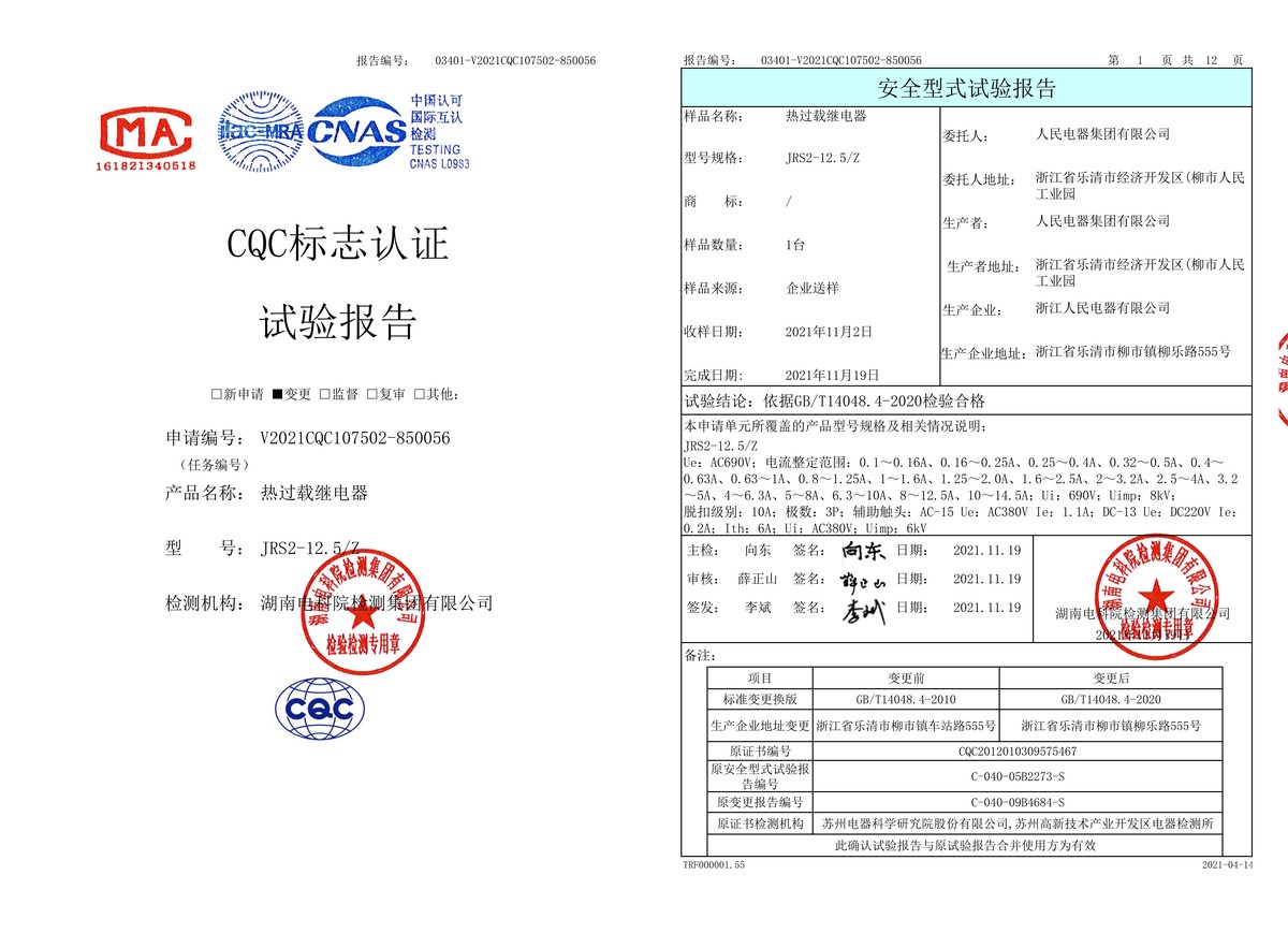 CQC试验报告(202111):JRS2-12.5/Z热过载继电器(点击下载)