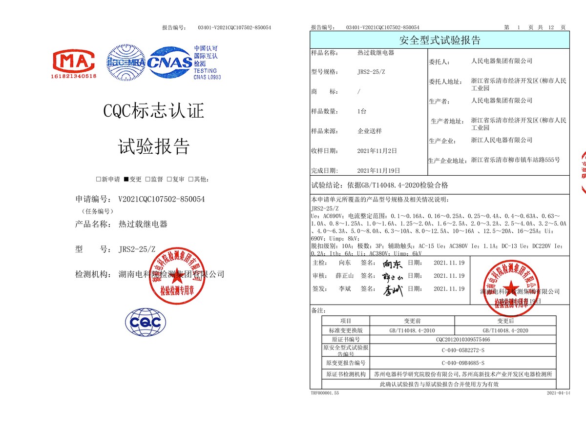CQC试验报告(202111):JRS2-25/Z热过载继电器(点击下载)