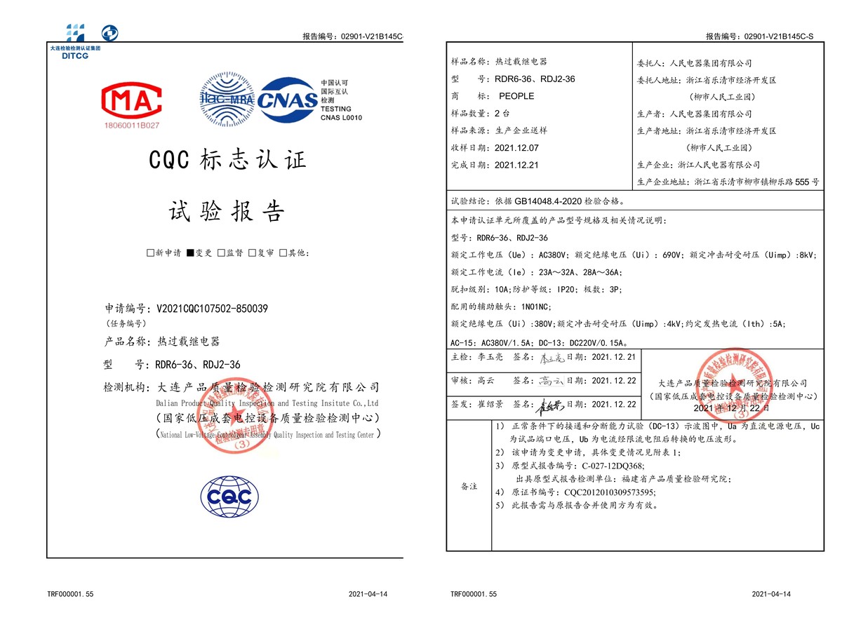 CQC试验报告(202112):RDR6-36,RDJ2-36热过载继电器(点击下载)
