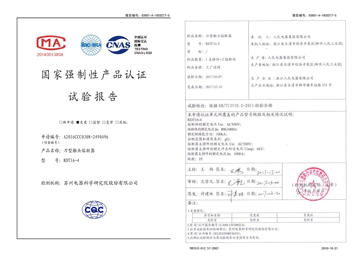 CCC试验报告(201703):RDT16-4刀型触头熔断器(点击下载)