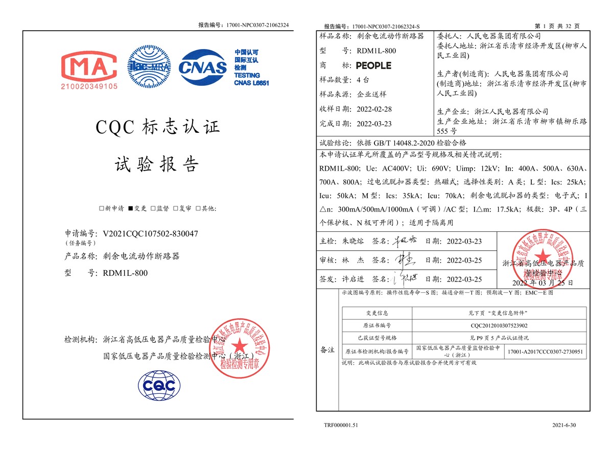 CQC试验报告(202203):RDM1L-800系列剩余电流动作断路器(点击下载)