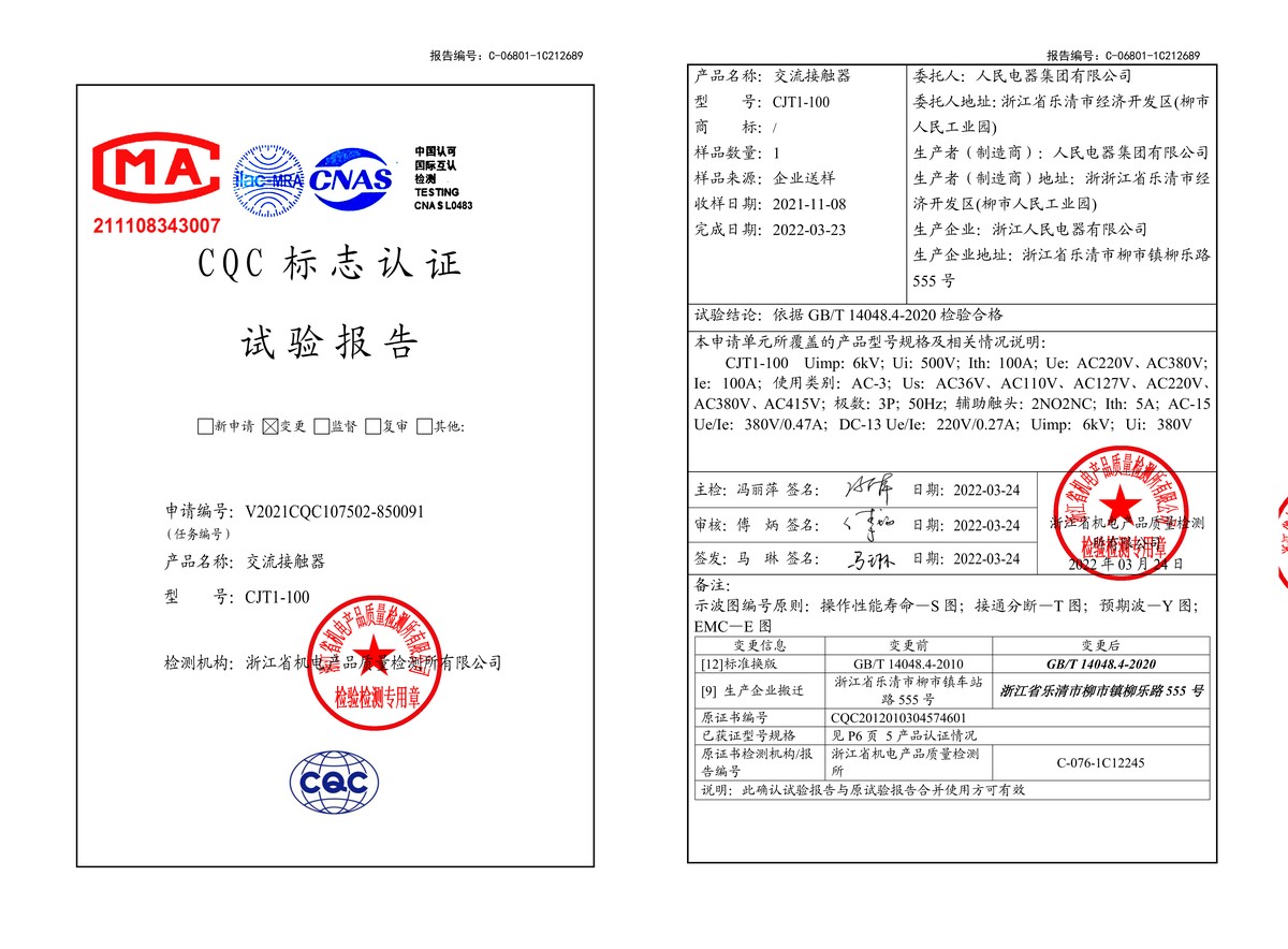 CQC试验报告(202203):CJT1-100交流接触器(点击下载)