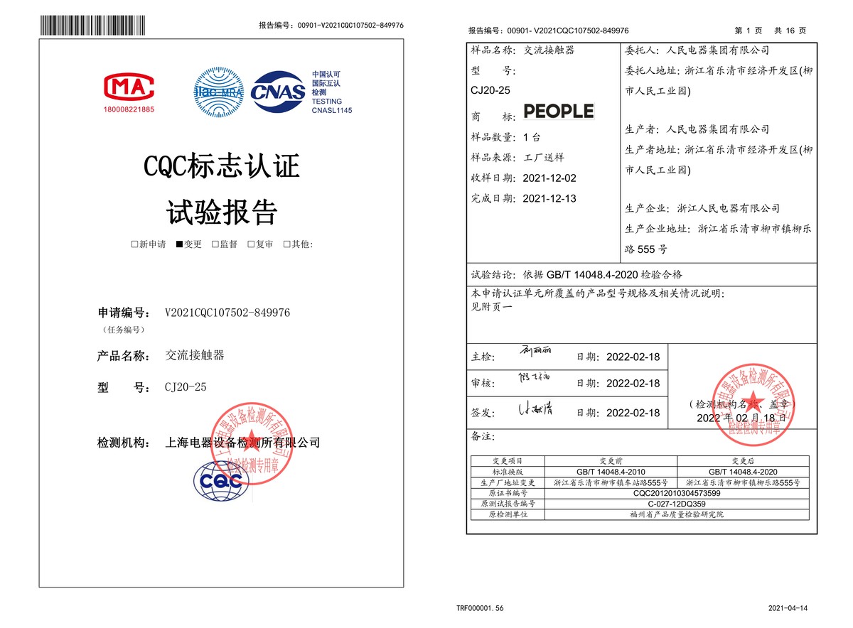 CQC试验报告(202202):CJ20-25交流接触器(点击下载)