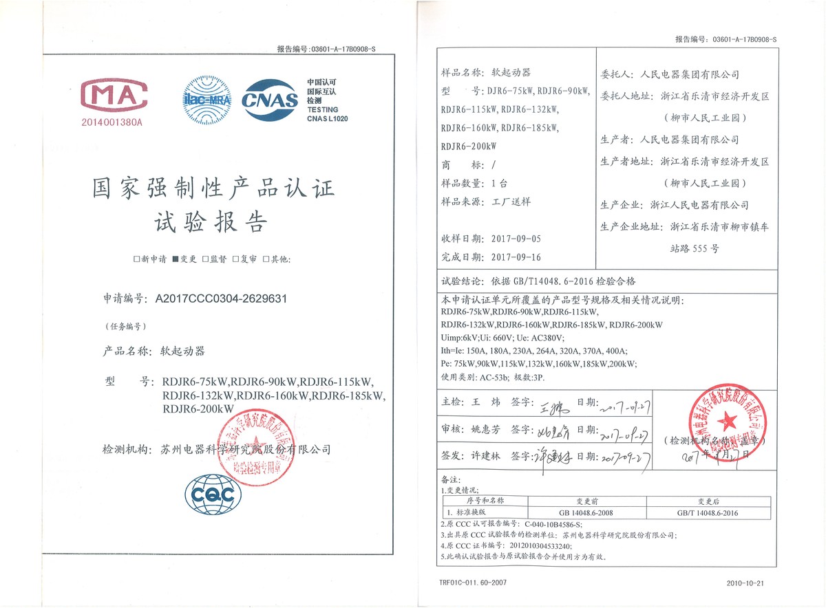 CCC试验报告(201709):RDJR6-75kW,RDJR6-90kW,RDJR6-115kW,RDJR6-132kW,RDJR6-160kW,RDJR6-185kW, RDJR6-200kW软起...(点击下载)