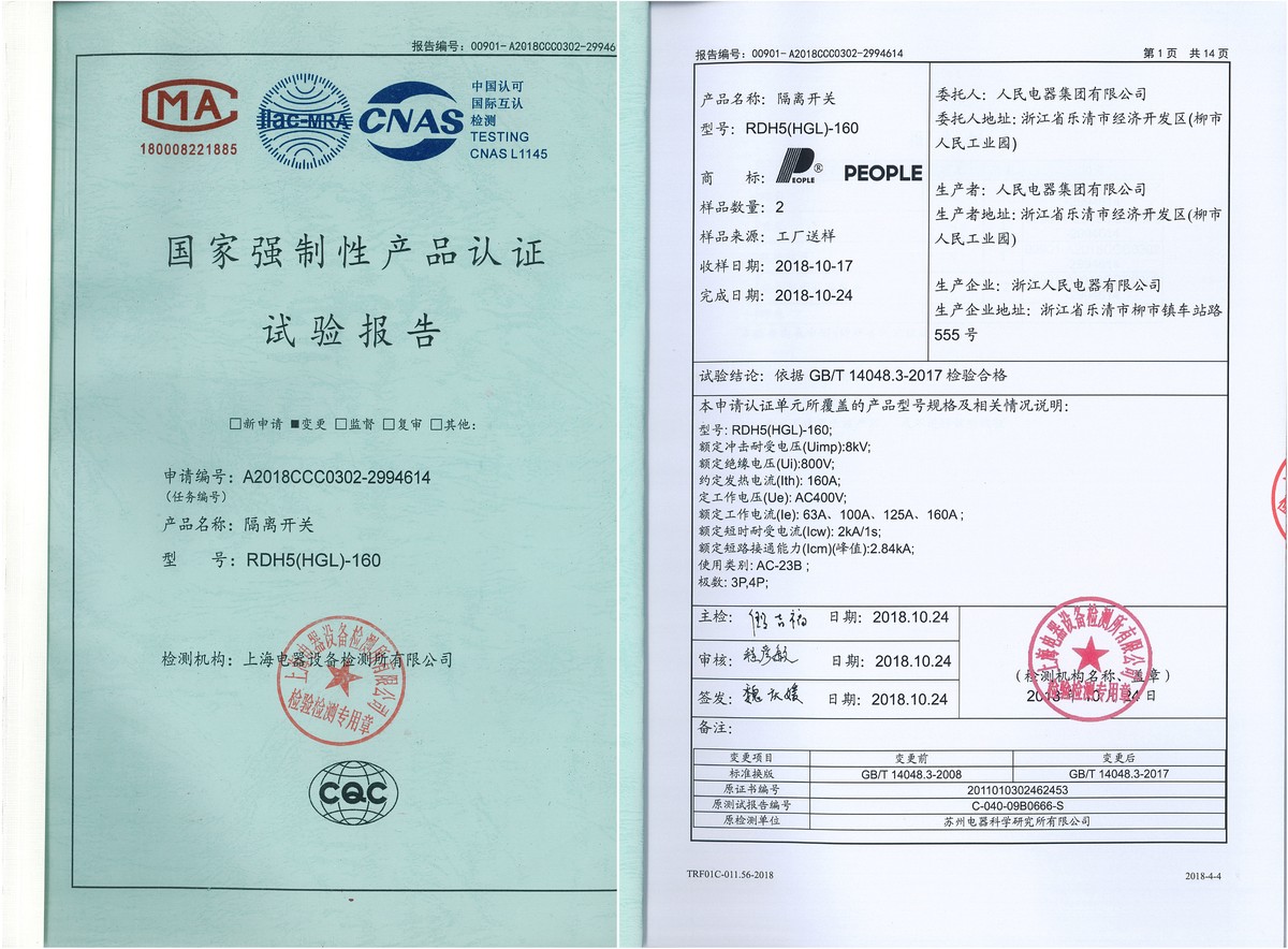 CCC试验报告(201810):RDH5(HGL)-160隔离开关(点击下载)