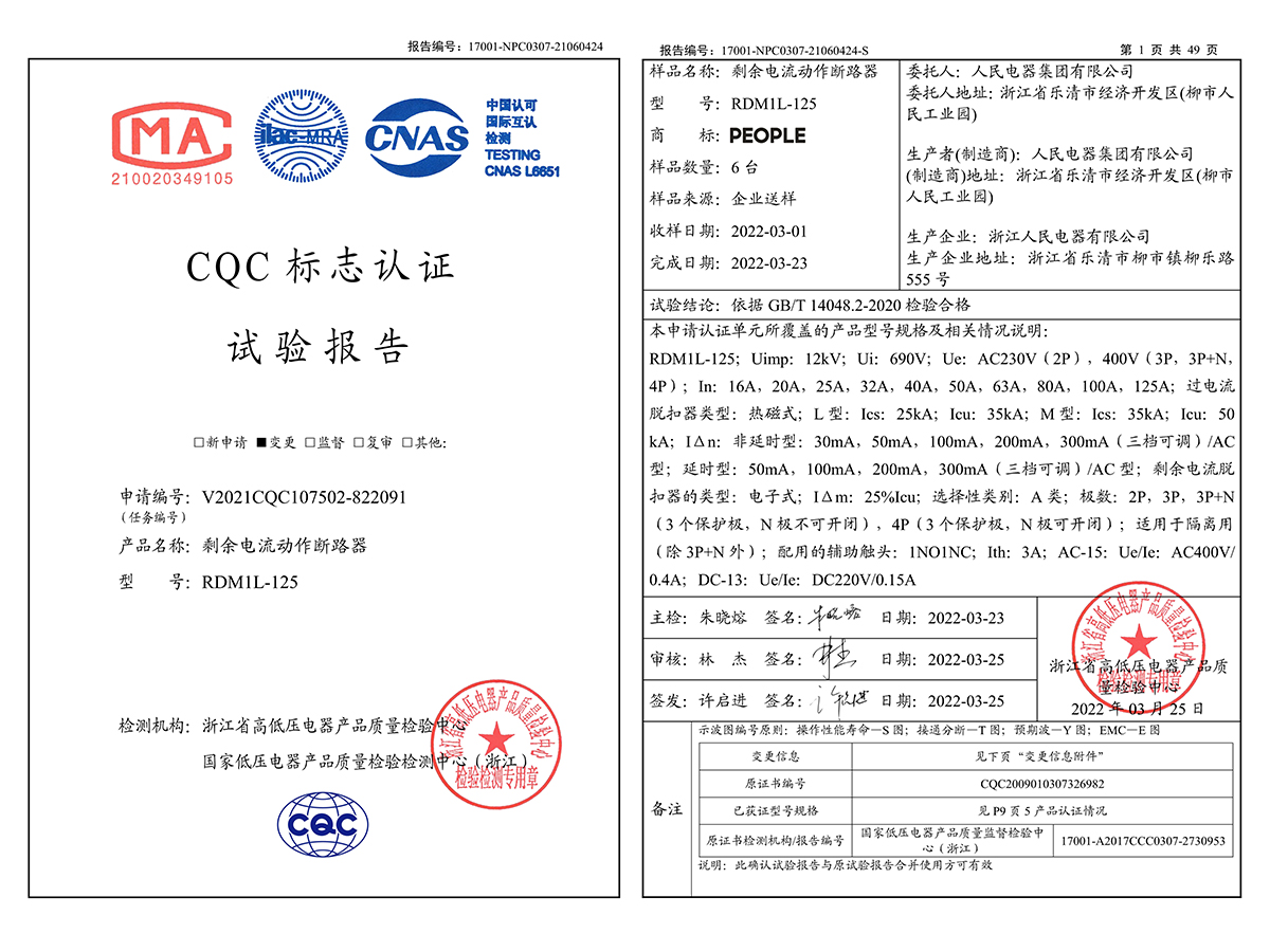 CQC试验报告(202203):RDM1L-125剩余电流动作断路器(点击下载)