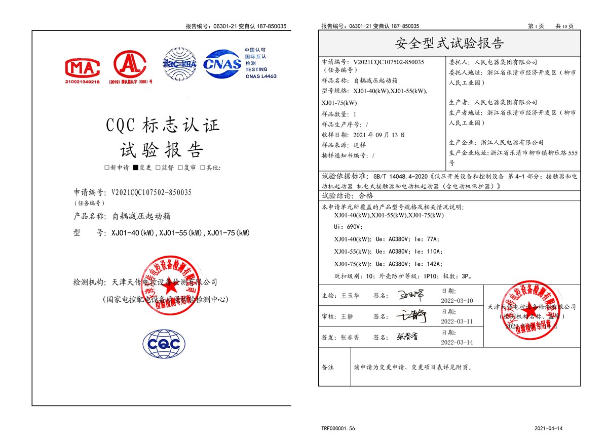 CQC试验报告(202203):XJ01-40,XJ01-55,XJ01-75自耦减压起动箱(点击下载)