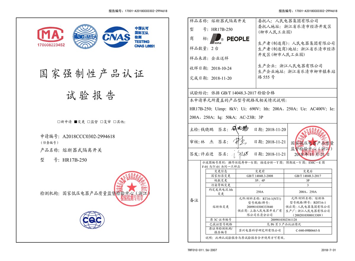 CCC试验报告(201811):HR17B-250熔断器式隔离开关(点击下载)