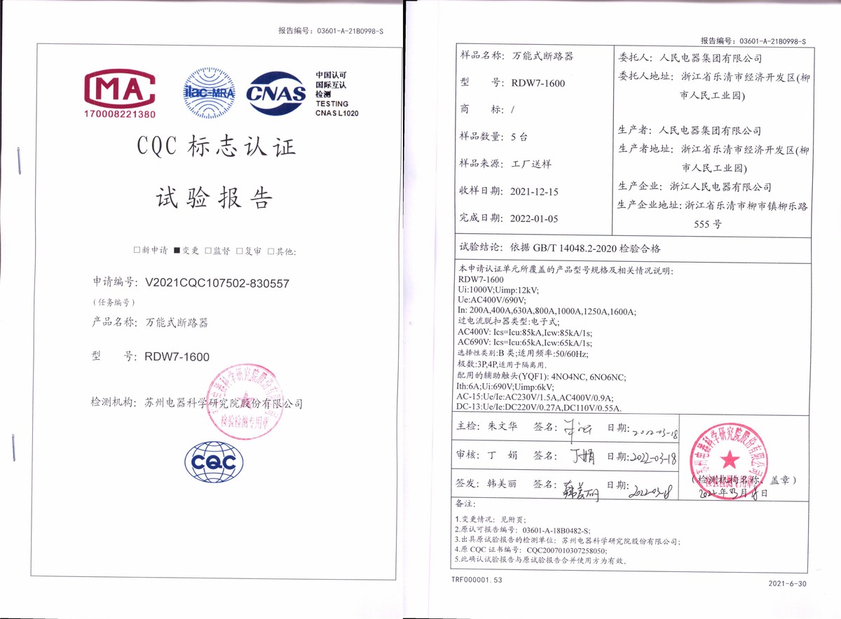 CQC试验报告(202203):RDW7-1600万能式断路器(点击下载)