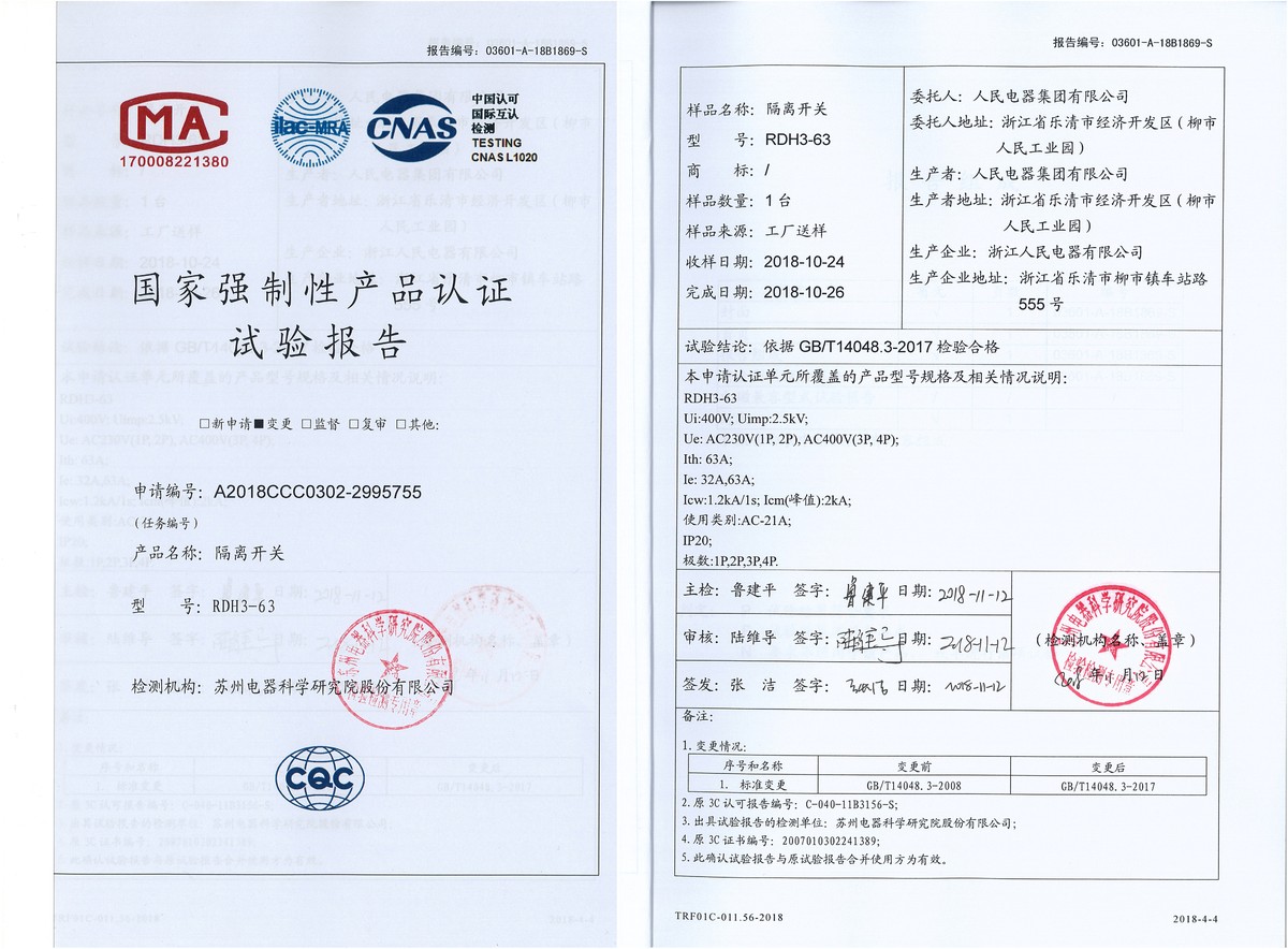 CCC试验报告(201811):RDH3-63隔离开关(点击下载)