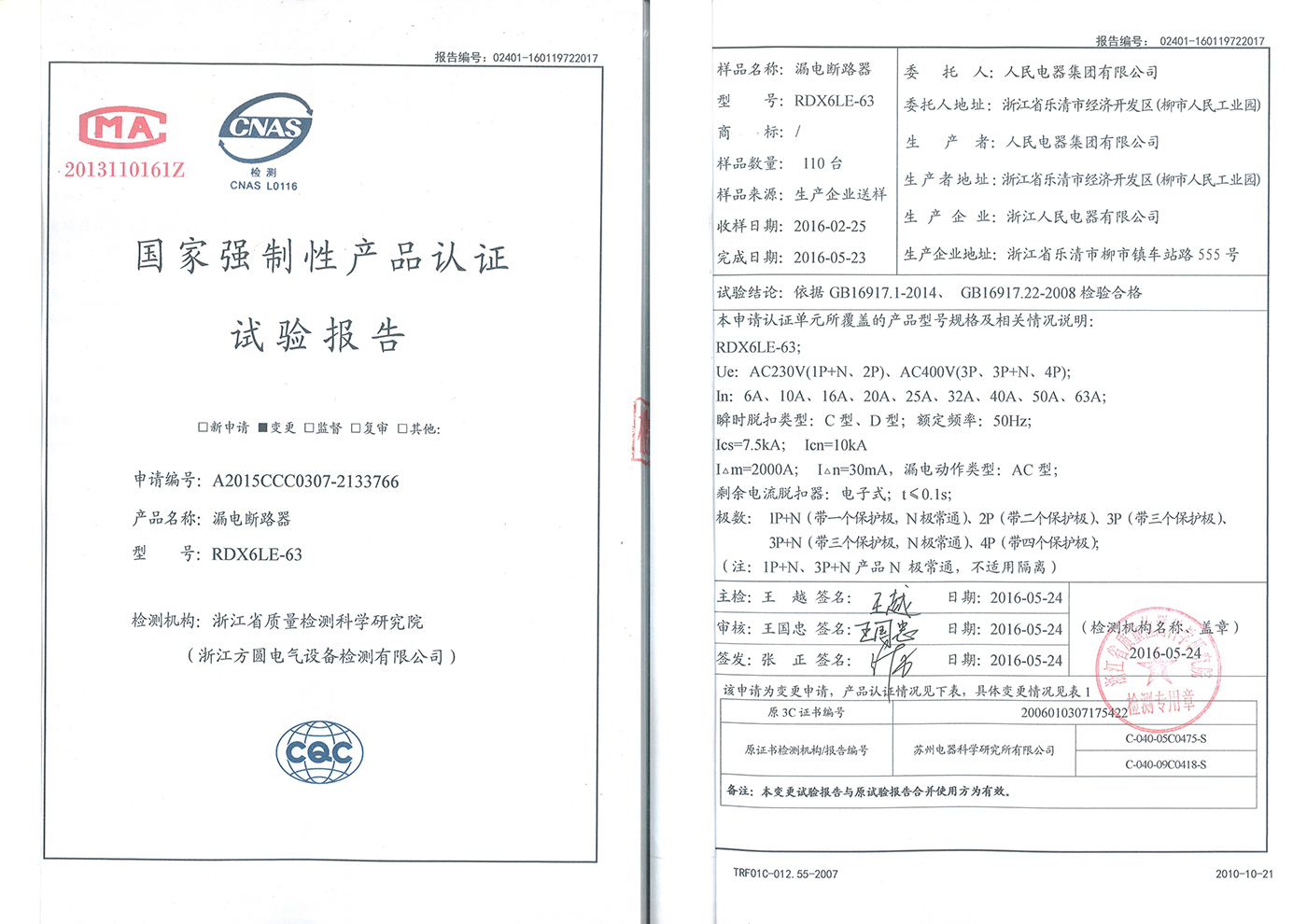 CCC试验报告(201605):RDX6LE-63剩余电流动作断路器(报告编号:02401-160119722017)(点击下载)