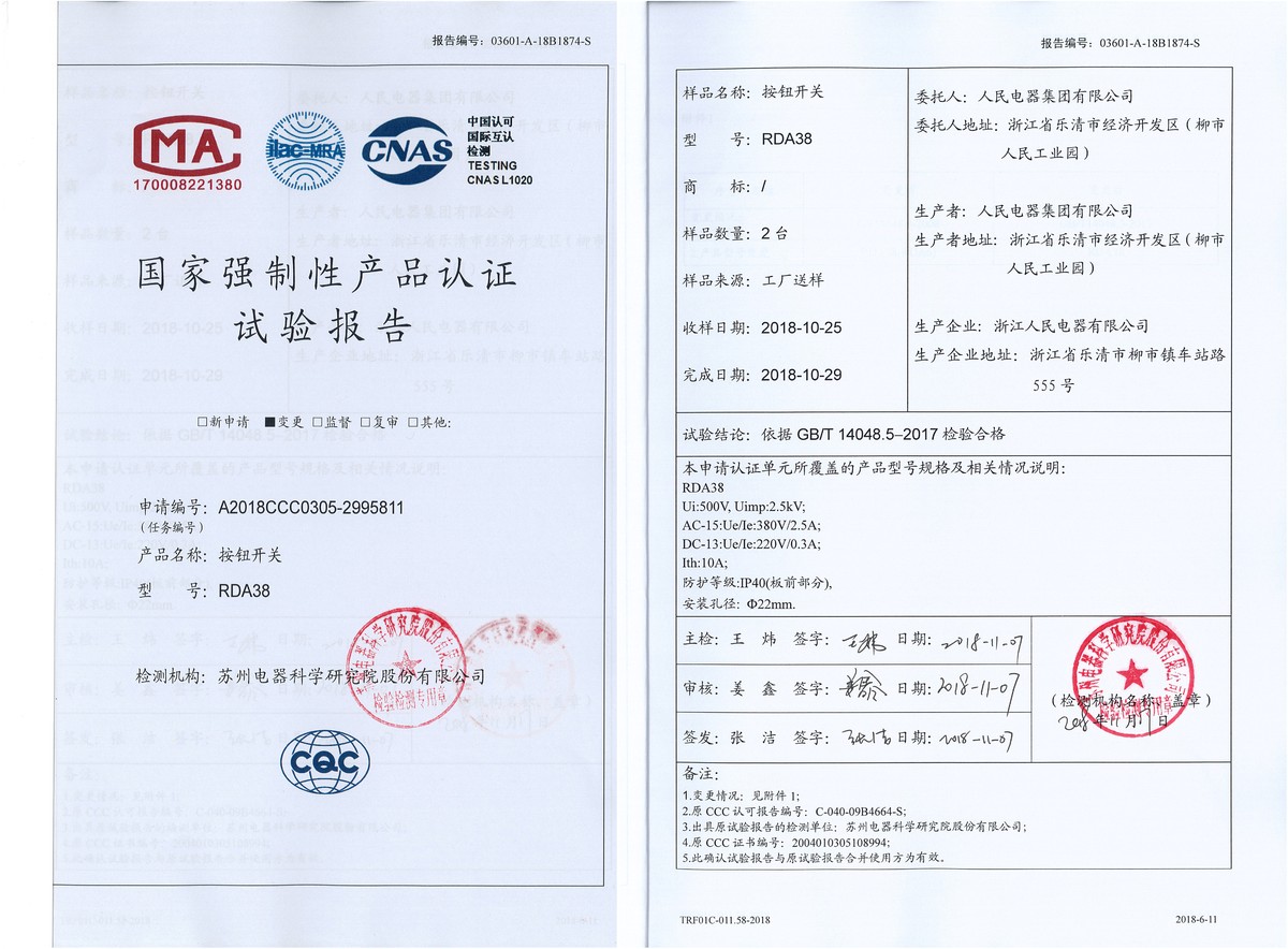 CCC试验报告(201811):RDA38按钮开关(点击下载)
