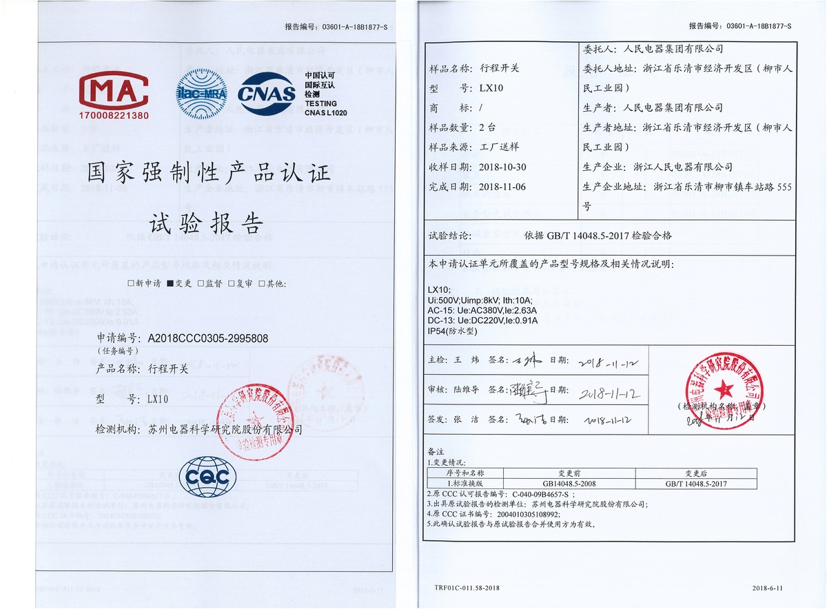 CCC试验报告(201811):LX10行程开关(点击下载)