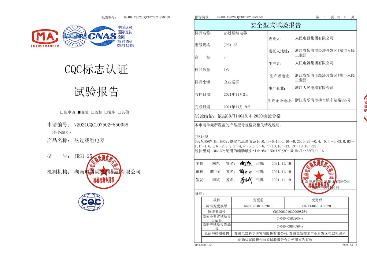 CQC试验报告(202111):JRS1-25热过载继电器(点击下载)