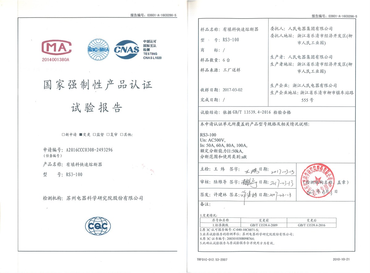 CCC试验报告(201703):RS3-100有填料快速熔断器(点击下载)