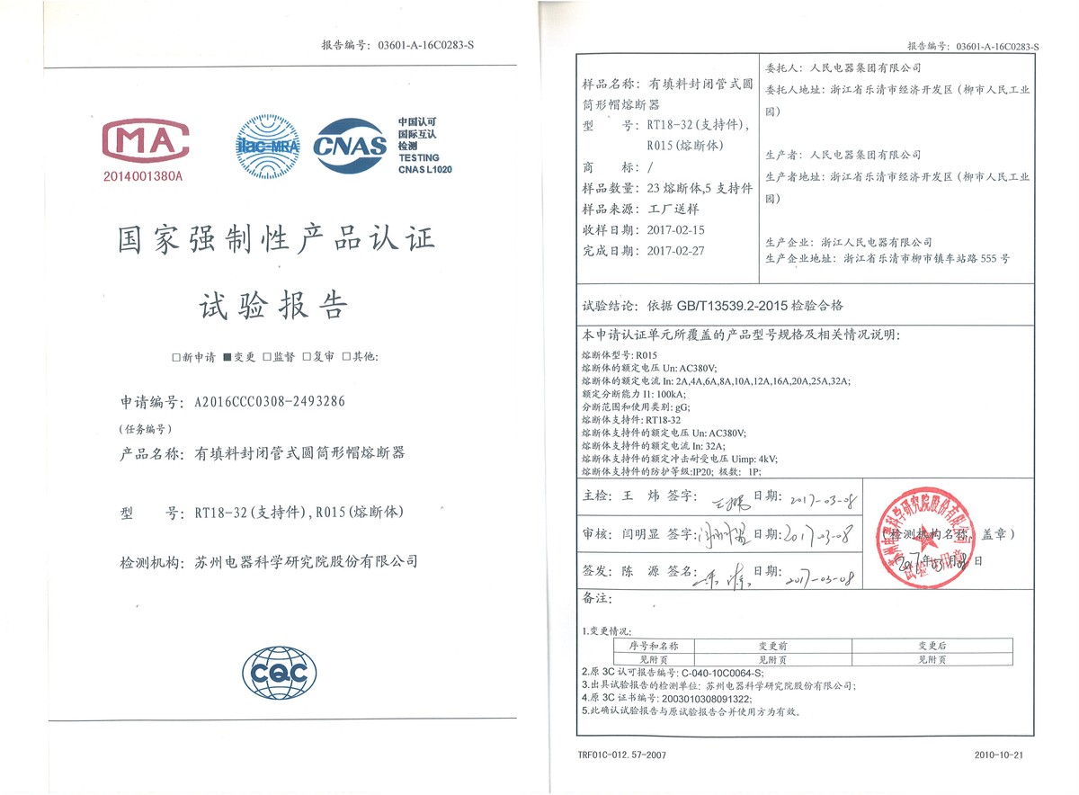 CCC试验报告(201703):RT18-32/R015有填料封闭管式圆筒形帽熔断器(点击下载)