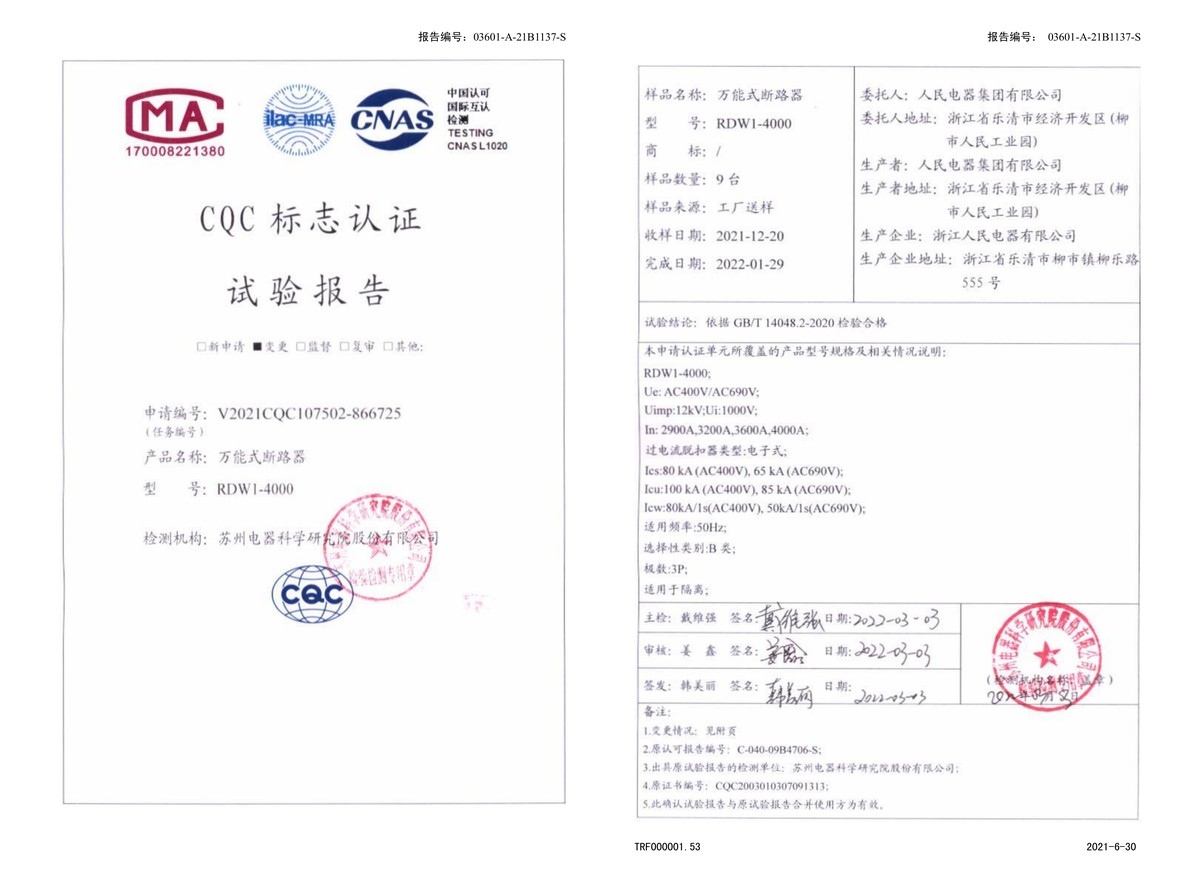 CQC试验报告(202203):RDW1-4000万能式断路器(点击下载)
