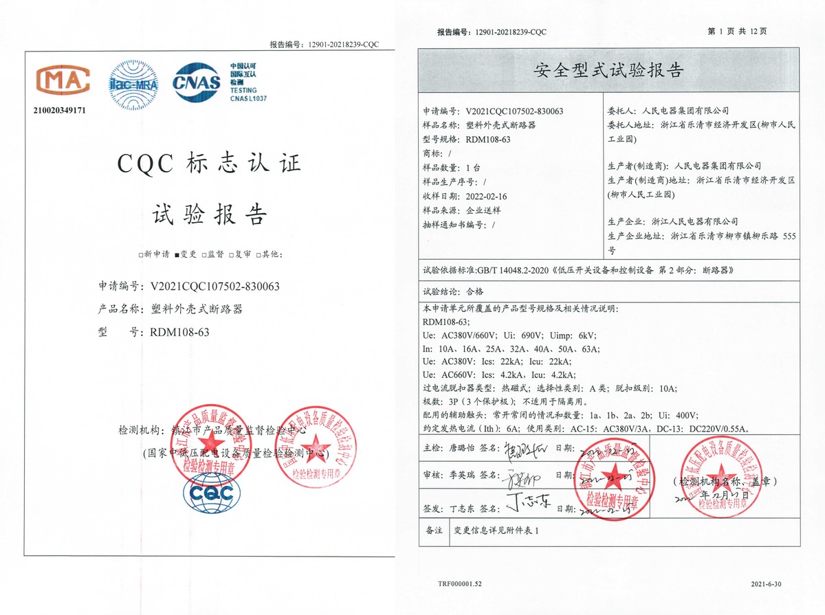 CQC试验报告(202202):RDM108-63塑料外壳式断路器(点击下载)