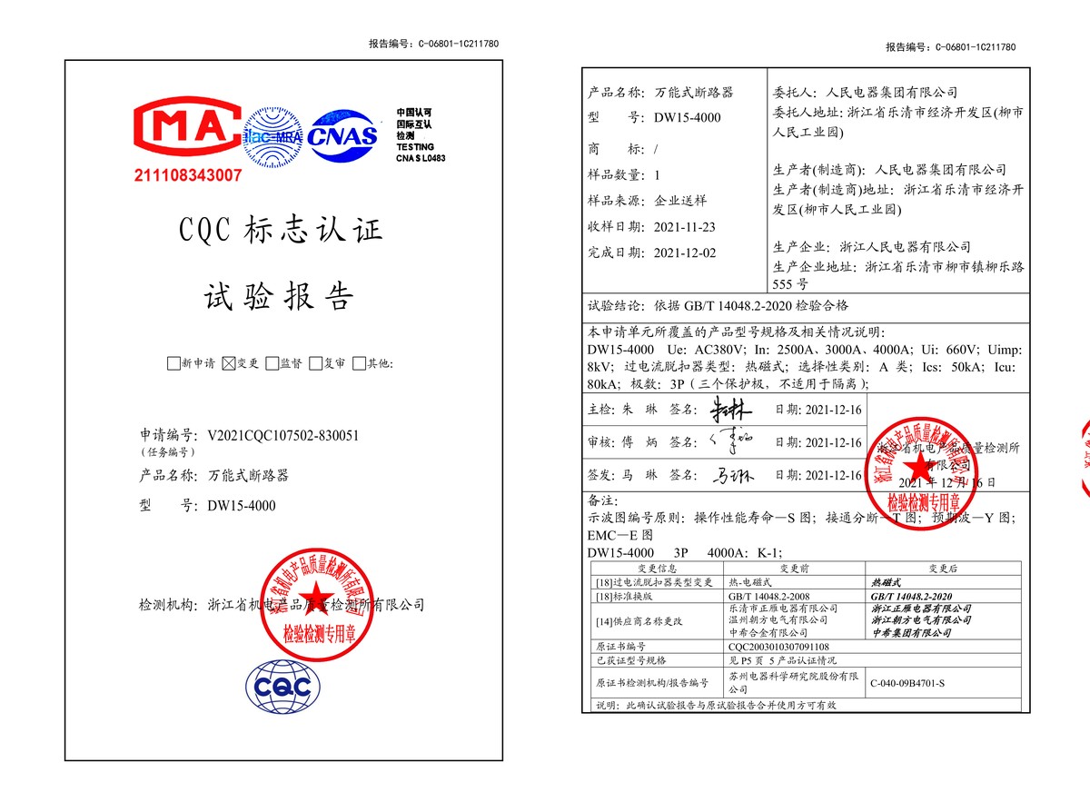 CQC试验报告(202112):DW15-4000万能式断路器(点击下载)