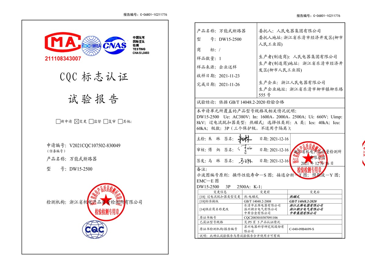 CQC试验报告(202112):DW15-2500万能式断路器(点击下载)