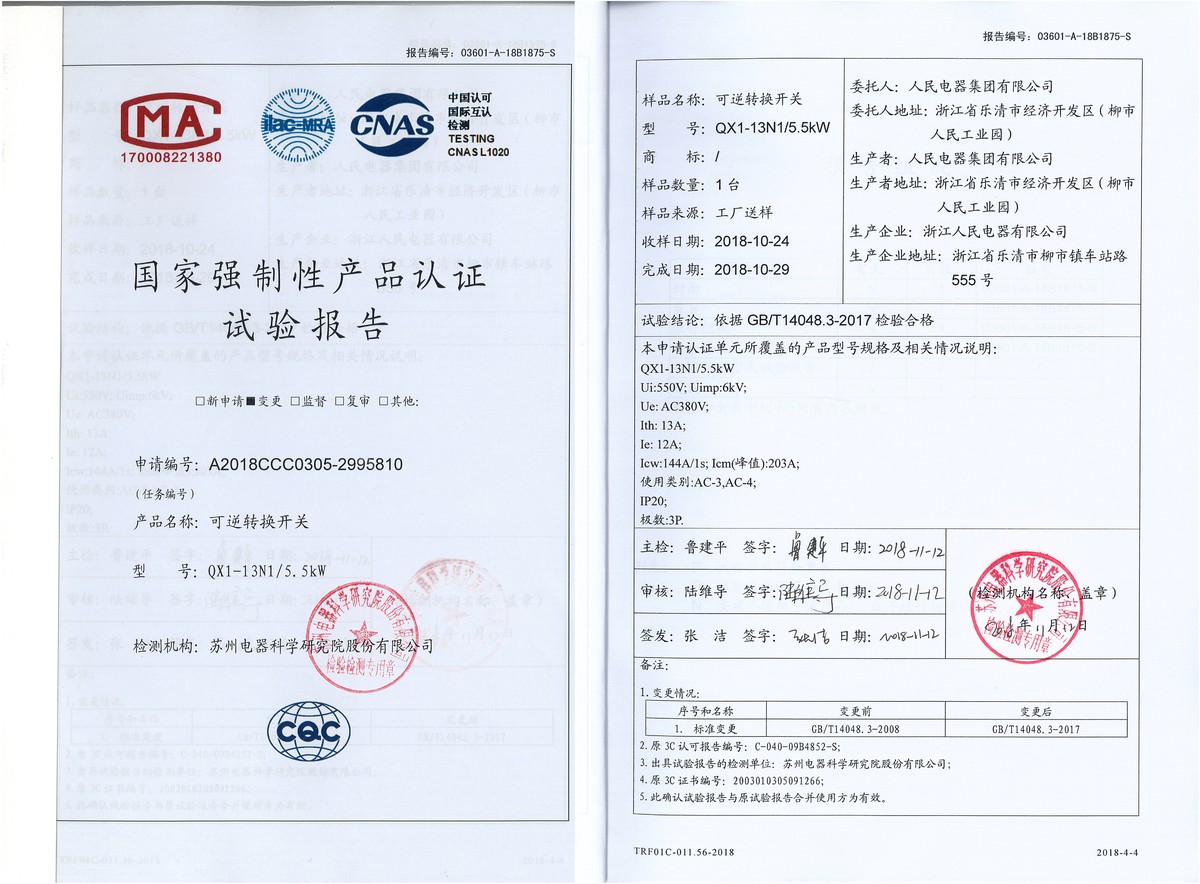 CCC试验报告(201811):QX1-13N1可逆转换开关(点击下载)