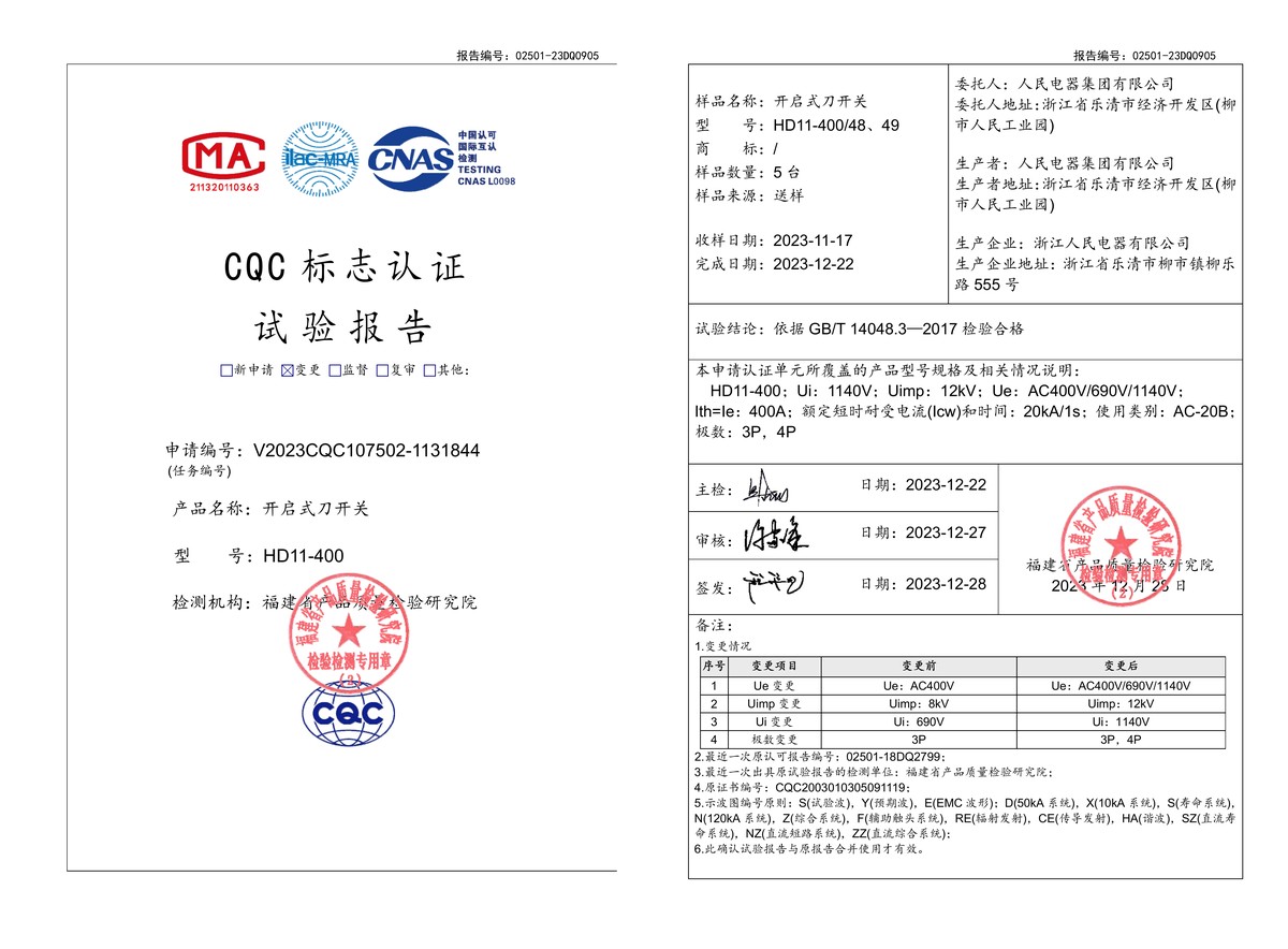 CQC试验报告(202312):HD11-400开启式刀开关(点击下载)