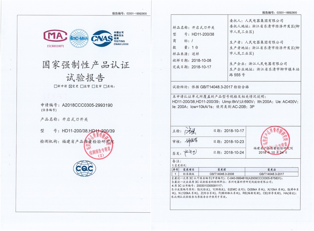 CCC试验报告(201810):HD11-200开启式刀开关(点击下载)