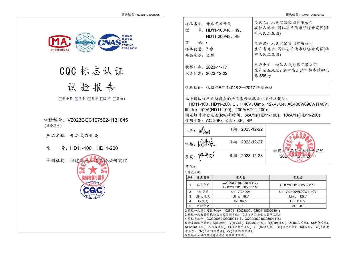 CQC试验报告(202312):HD11-100开启式刀开关(点击下载)