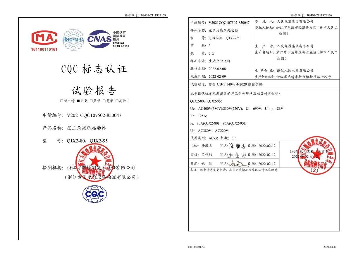 CQC试验报告(202202):QJX2-80,QJX2-95星三角减压起动器(点击下载)