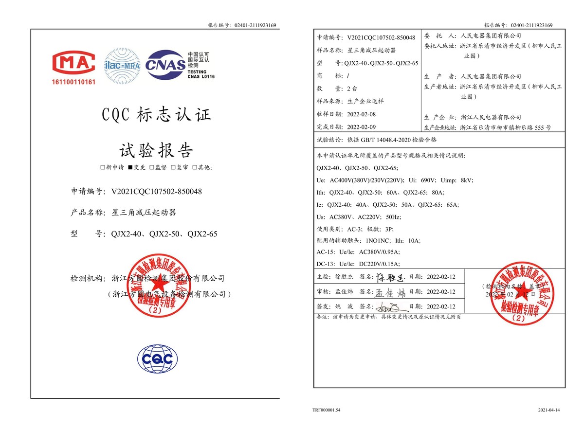 CQC试验报告(202202):QJX2-40,QJX2-50,QJX2-65星三角减压起动器(点击下载)