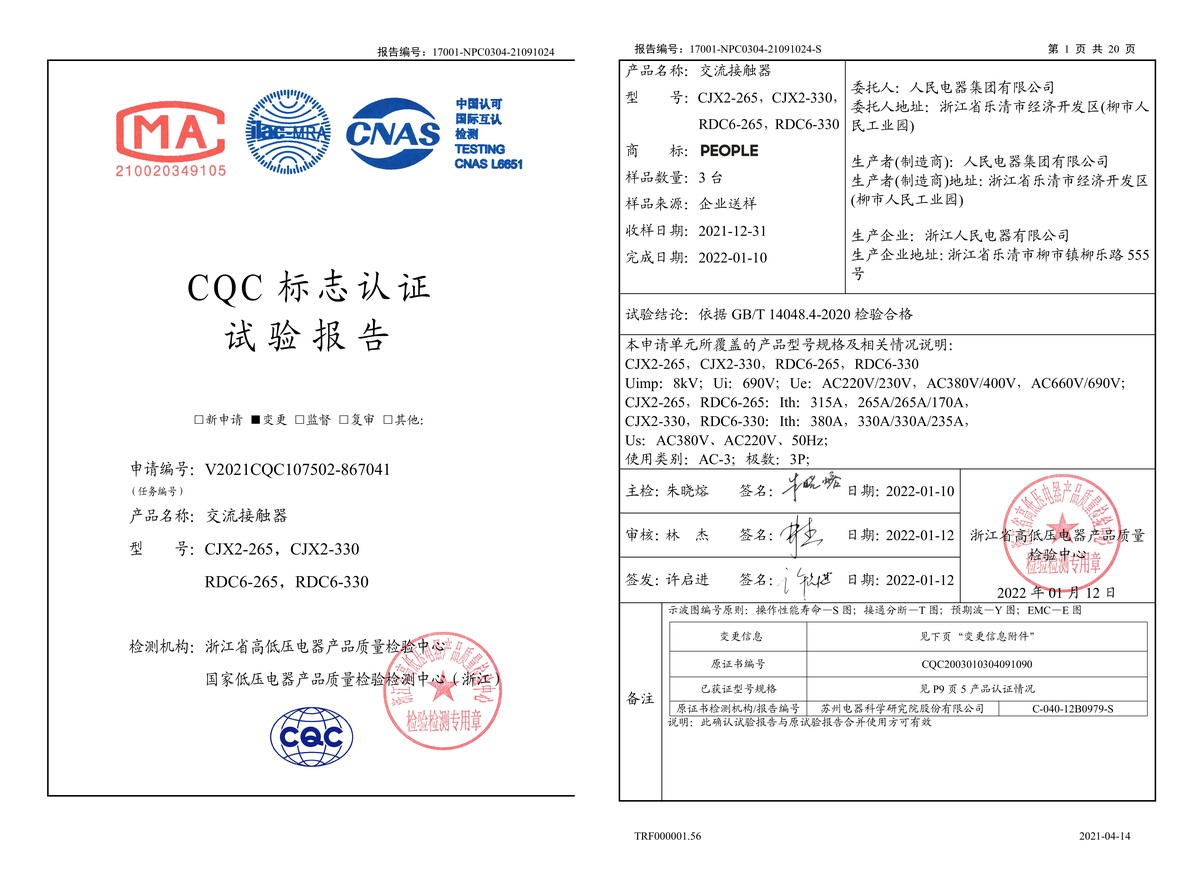 CQC试验报告(202201):CJX2-265,CJX2-330,RDC6-265,RDC6-330交流接触器(点击下载)