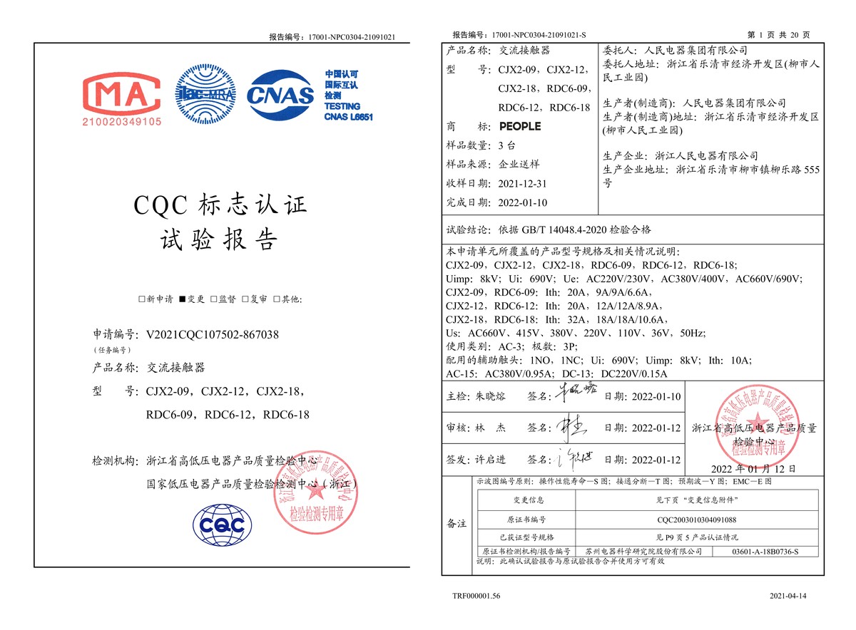 CQC试验报告(202201):CJX2-09,CJX2-12,CJX2-18,RDC6-09,RDC6-12,RDC6-18交流接触器(点击下载)