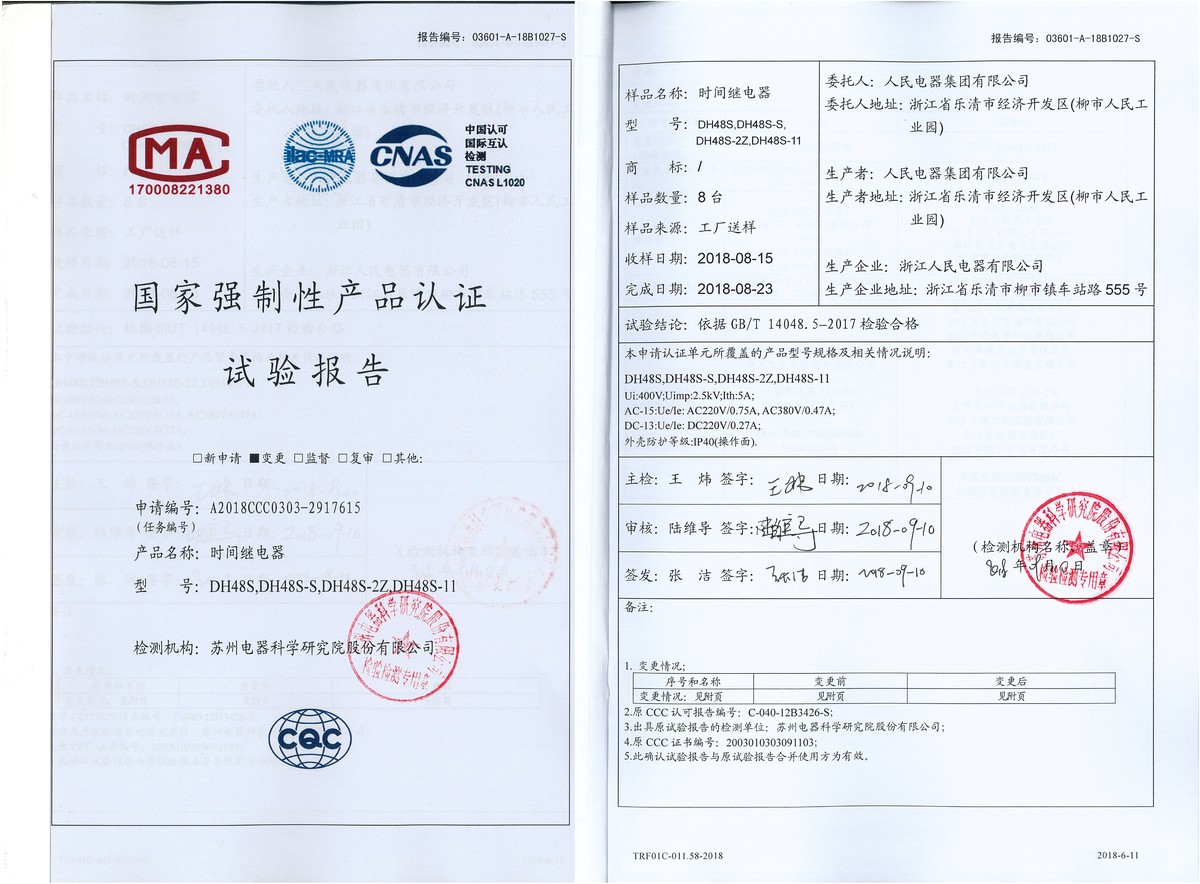 CCC试验报告(201809):DH48S,DH48S-S,DH48S-2Z,DH48S-11时间继电器(点击下载)