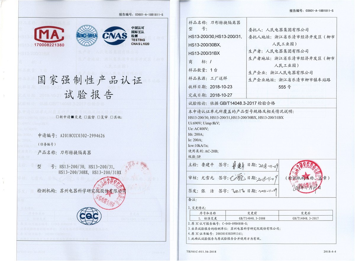 CCC试验报告(201811):HS13-200刀形转换隔离器(点击下载)