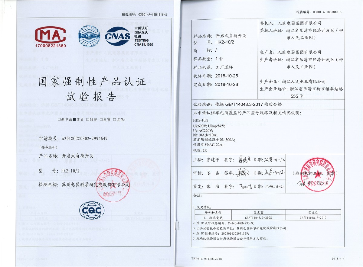 CCC试验报告(201811):HK2-10/3开启式负荷开关(点击下载)