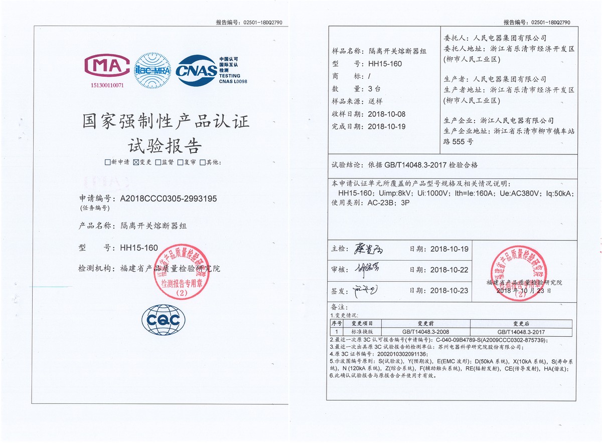 CCC试验报告(201810):HH15-160隔离开关熔断器组(点击下载)