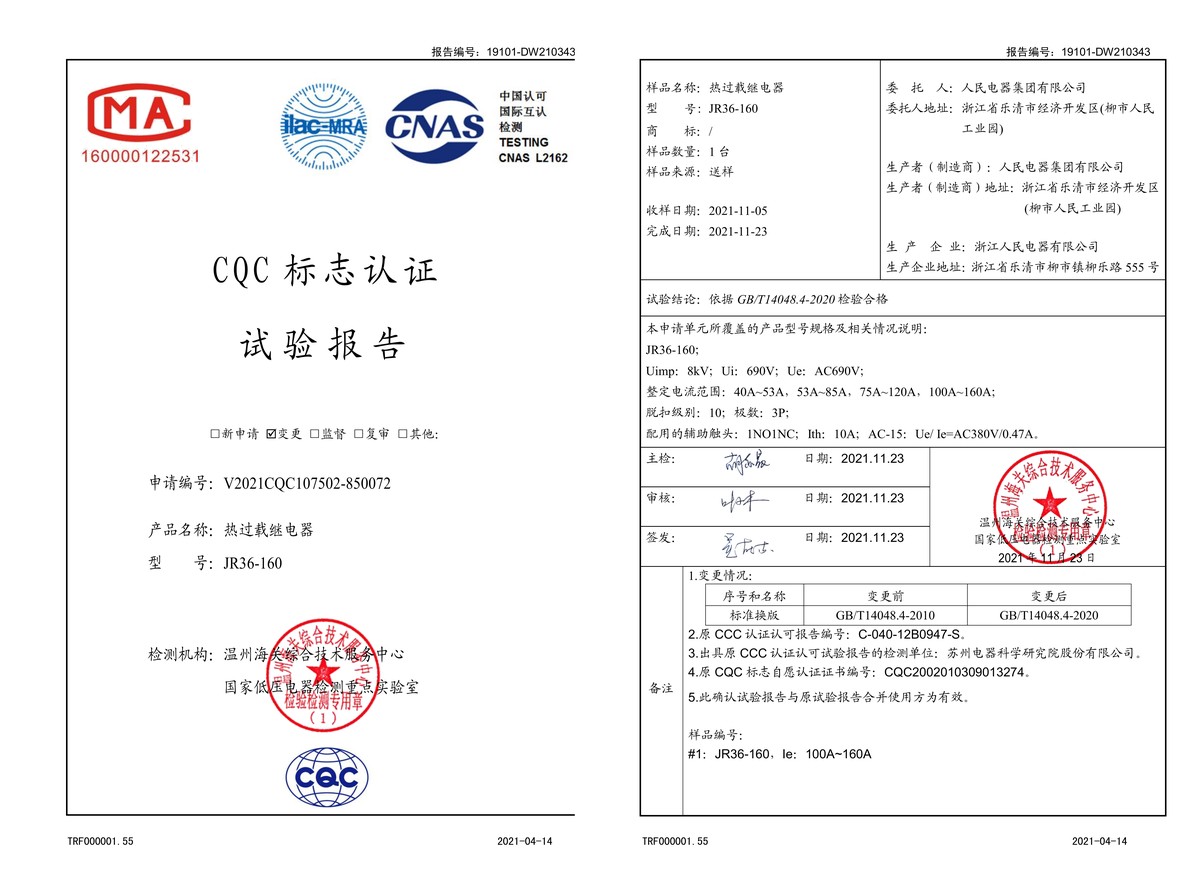 CQC试验报告(202111):JR36-160热过载继电器(点击下载)