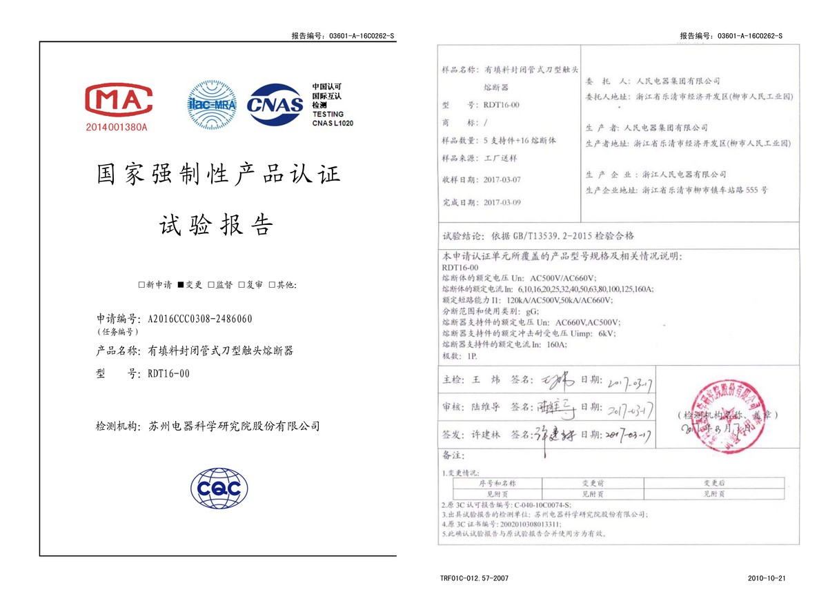CCC试验报告(201703):RDT16-00有填料封闭管式刀型触头熔断器(点击下载)