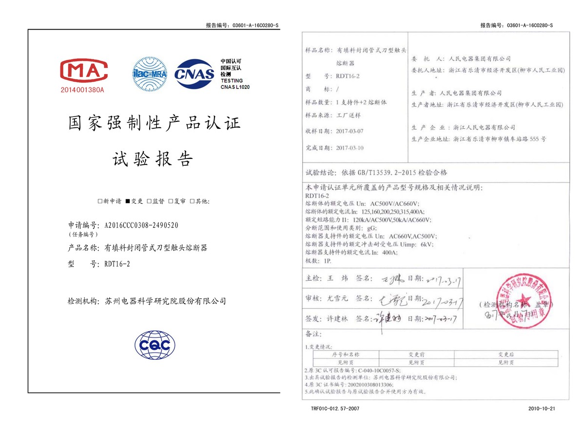 CCC试验报告(201703):RDT16-2有填料封闭管式刀型触头熔断器(点击下载)