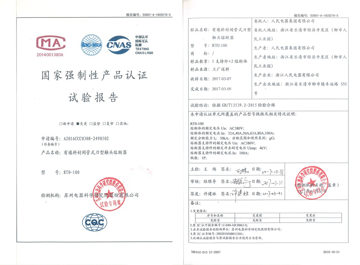 CCC试验报告(201703):RT0-100有填料封闭管式刀型触头熔断器(点击下载)