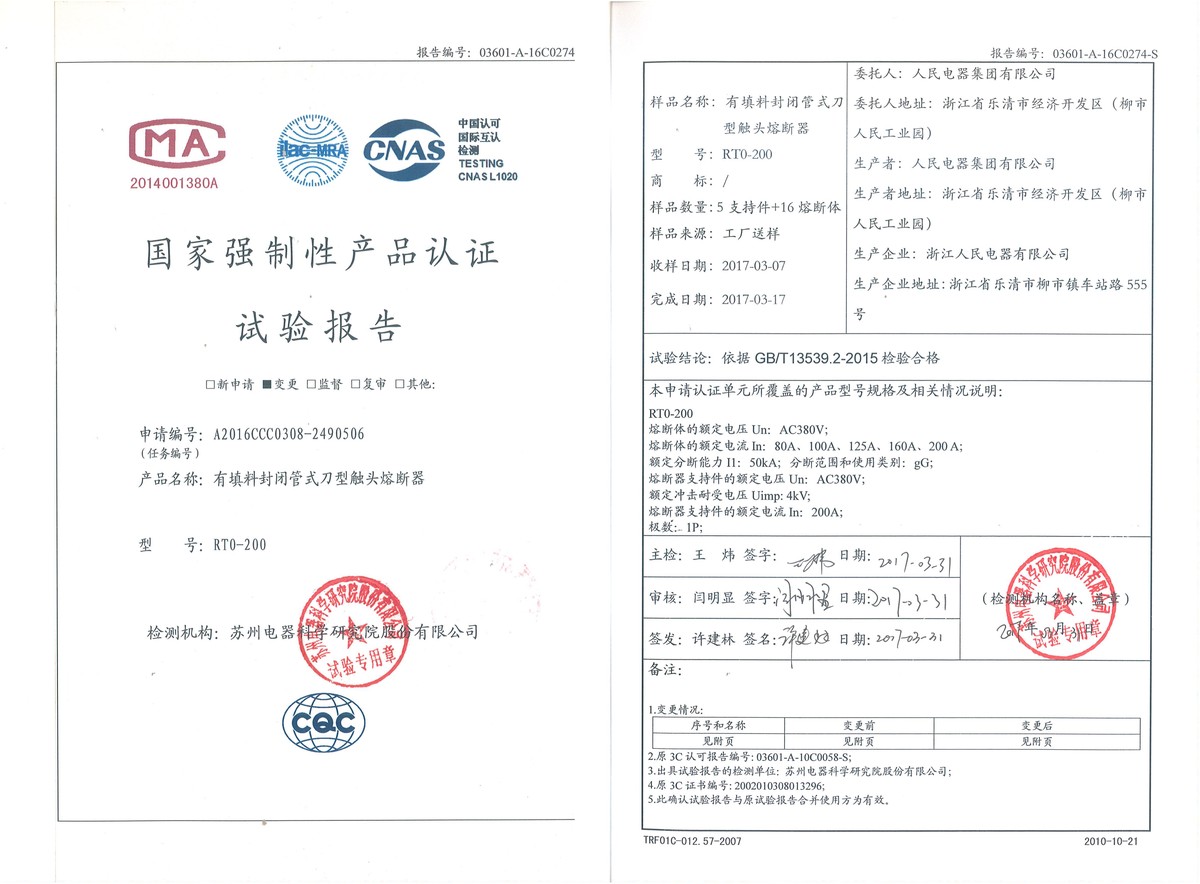 CCC试验报告(201703):RT0-200有填料封闭管式刀型触头熔断器(点击下载)